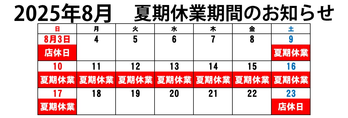 夏期休業期間:2025年8月9日(土)~ 2025年8月17日(日)