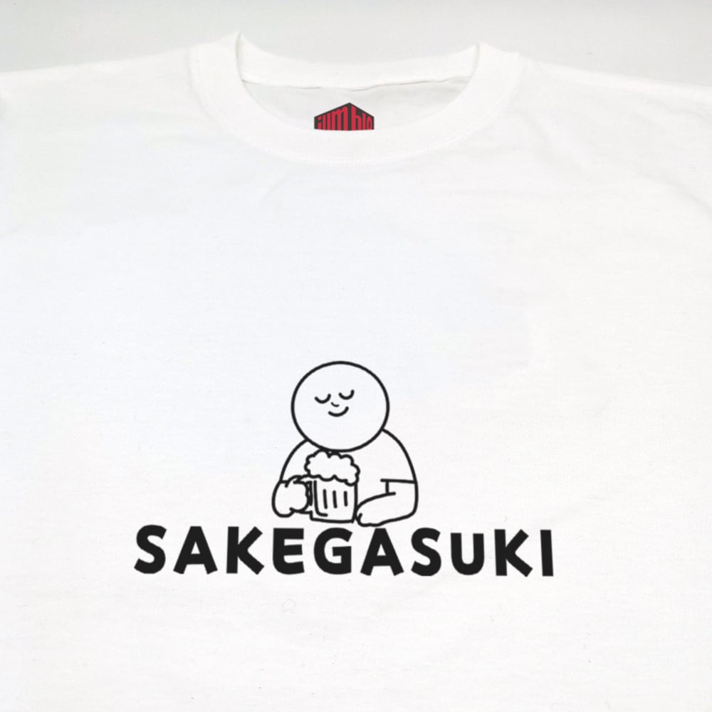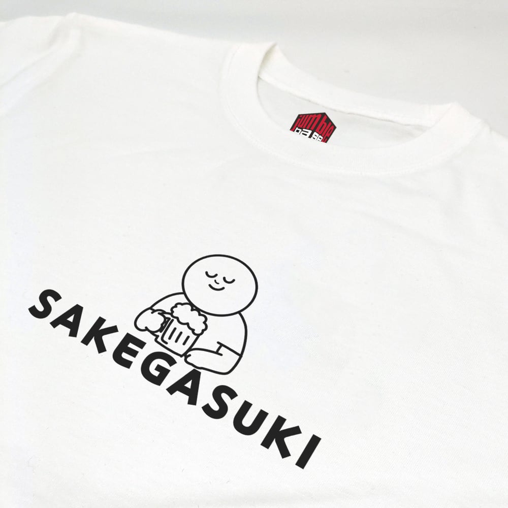 「SAKEGASUKI」の文字と、ビールジョッキを片手に幸せそうな表情のイラストを胸元にプリント。